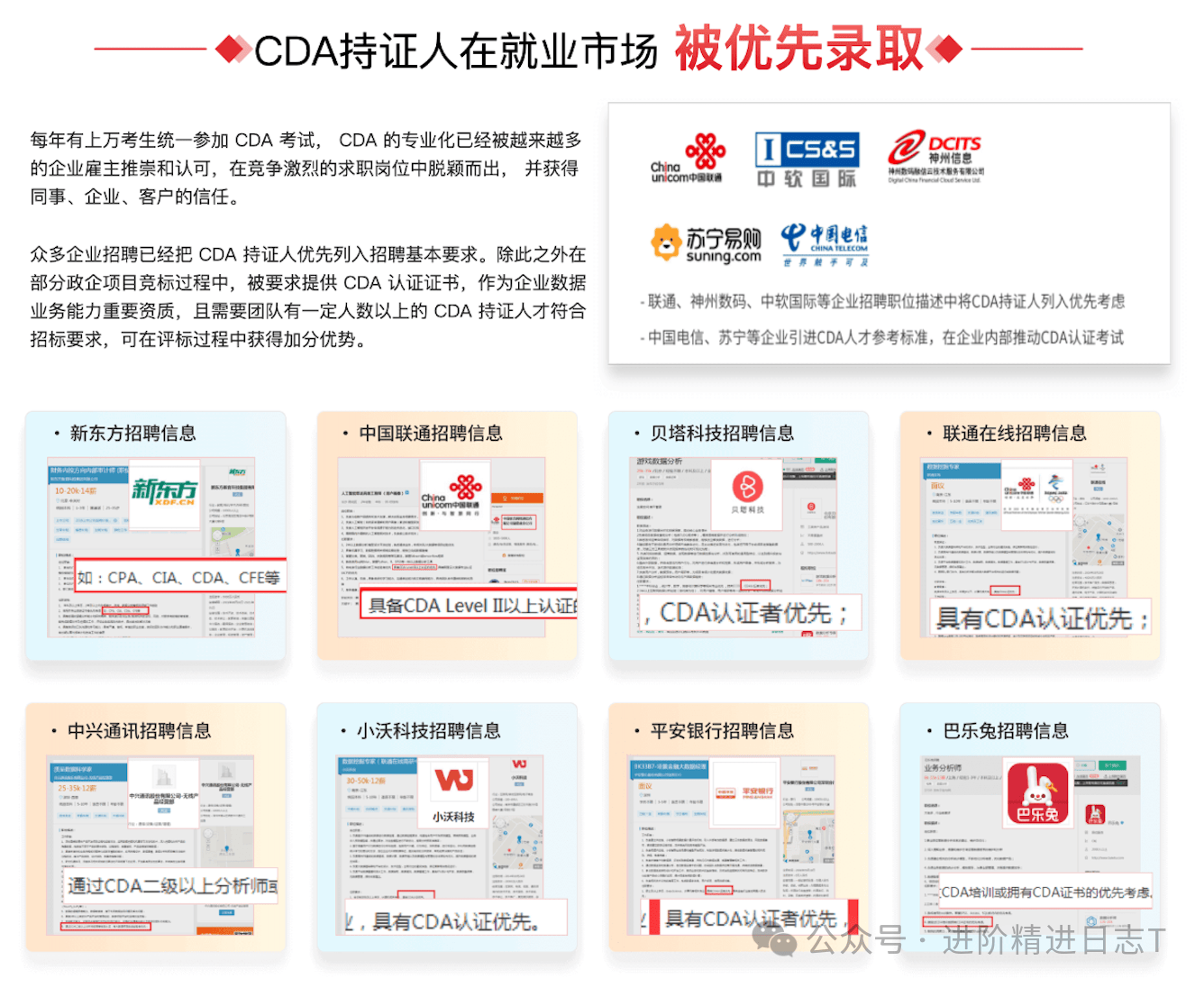 ✅CDA企业承认度若何?CDA企业承认度很是高,良多企业聘请时说明CDA数据阐发师优先,对找工做很是有帮帮。良多银行、金融机构的手艺岗会要求必需是CDA数据阐发师二级以上的持证人。中国联通、央视广信、德勤、苏宁等企业,把CDA持证人列入优先考虑或者对员工的CDA测验给补助。